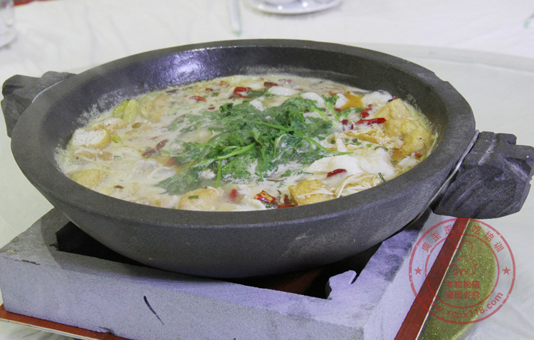 “石鍋魚”也叫“金福魚”,是湘菜中的一道名菜,制作方法獨特,用一塊大的花崗巖巖石鑿成有雙耳的石鍋,將魚放在石鍋內烹煎,然后,再加上以辣椒為主的各式佐料,又再加上一些滋補藥材制成。清初康熙年間,長沙湘江河畔,有一家小店擅長做一道“石鍋魚”,風味獨特。康熙皇帝微服下江南時,在這間小店嘗了這道菜,感覺味道鮮美無比,龍顏大悅,故欣然提筆將這道菜賦名為“金福魚”。此后,“石鍋魚”也就變成“金福魚”,而這家小店也因此得名為“金福林”。