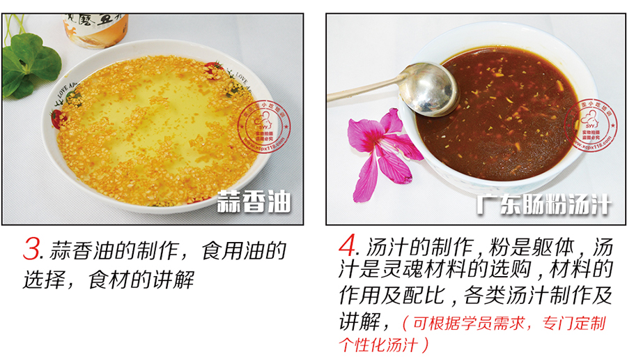 師傅介紹制作蒜香油所用材料和蒜香油怎樣使用,學員和師傅一起動手制作蒜香油,師傅和學員一起動手準備調湯汁的配料。師傅介紹調湯汁所用配料的特性和比例,師傅先調湯汁,學員再動手調,調完后再由師傅點評學員所調湯汁的優(yōu)缺點。師傅介紹瘦肉的腌制材料,一起動手腌制瘦肉,使蒸出來的腸粉瘦肉達到嫩和好味道(市面上做腸粉的瘦肉一般都是沒有經(jīng)過腌制的,這樣的加到腸粉里面去的瘦肉沒有好的味道的而且也不夠嫩,吃在嘴里有點粗糙)。
