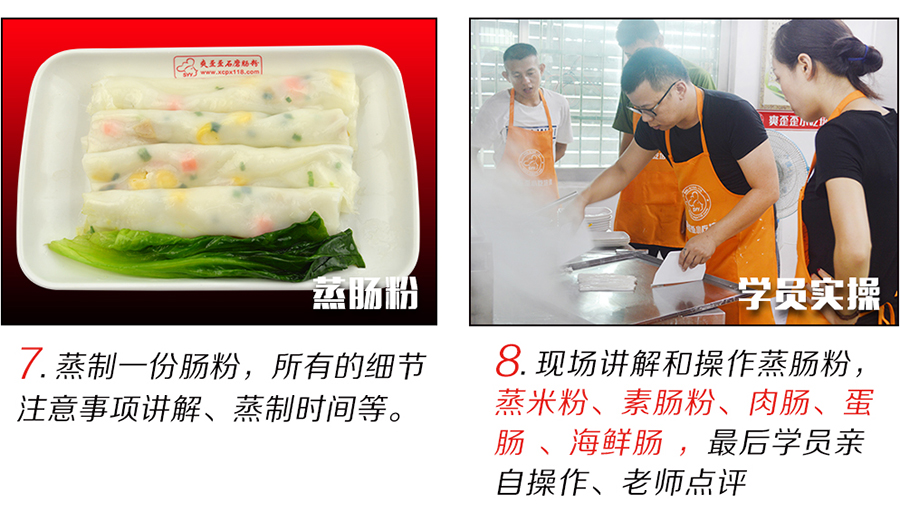 師傅介紹爽歪歪節(jié)能全自動腸粉機的使用和日常保養(yǎng),蒸腸粉時的注意事項,師傅動手制作講解港式腸粉做法和廣式腸粉做法,先由師傅親自動手制作一份腸粉學員品嘗,再由學員自己動手練習。