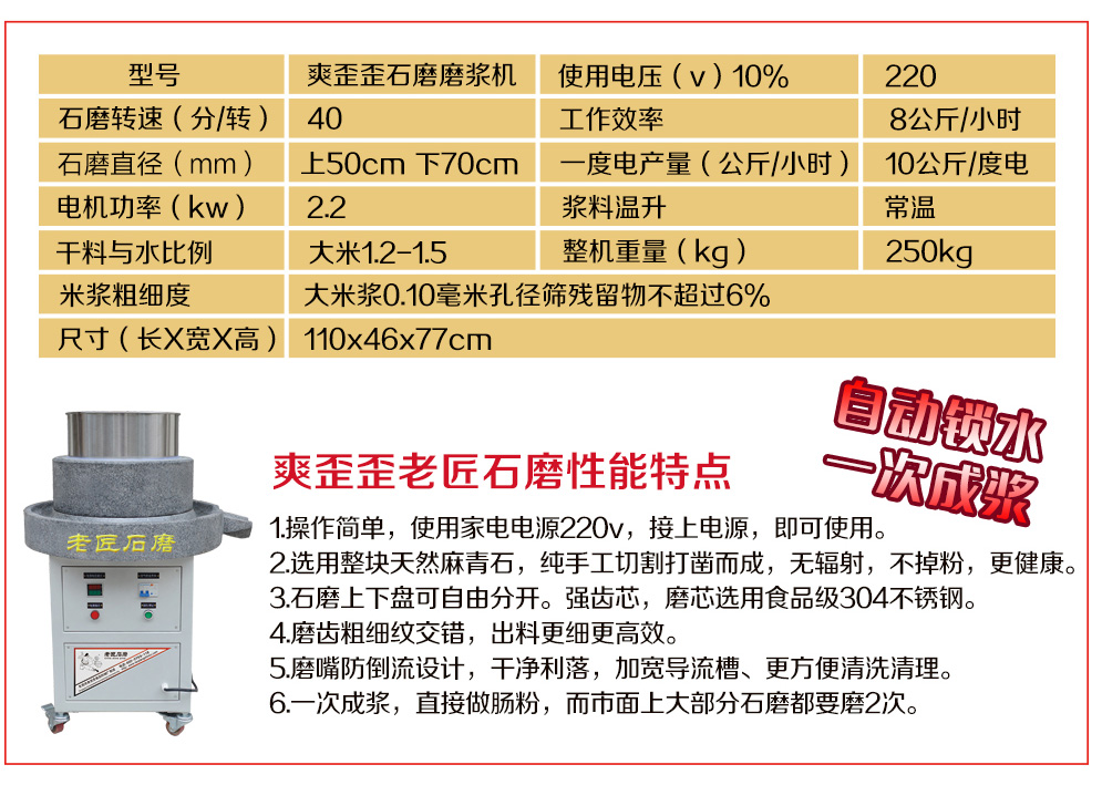石磨腸粉最大的制作工藝就是磨漿,磨漿是采用專用的石磨磨漿機(jī),出漿細(xì)膩嫩滑,做出來的腸粉爽口彈牙、米香味足、吃而不膩,純米漿的腸粉既營(yíng)養(yǎng)又健康! 石磨主要采用零放射性天然石材,含有多種礦物質(zhì)元素,純天然花崗巖之一的天然麻石制作而成,其顆粒均勻,質(zhì)地細(xì)膩,硬度適中,是一種對(duì)生物無毒、無害并具有一定生物活性的復(fù)合礦物質(zhì)對(duì)人體有益,綠色環(huán)保,有益健康;經(jīng)手工鑿刻,機(jī)械輔助制造而成。